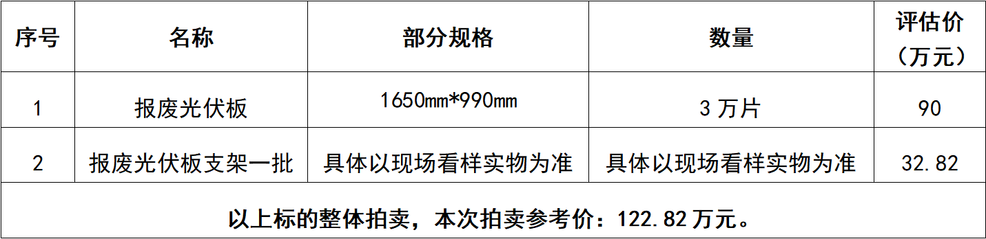 一、拍賣標的:報廢光伏板3萬片及報廢光伏板支架一批(具體以現(xiàn)場看樣實物為準),整體拍賣,參考價:122.82萬元。競買保證金:15萬元。