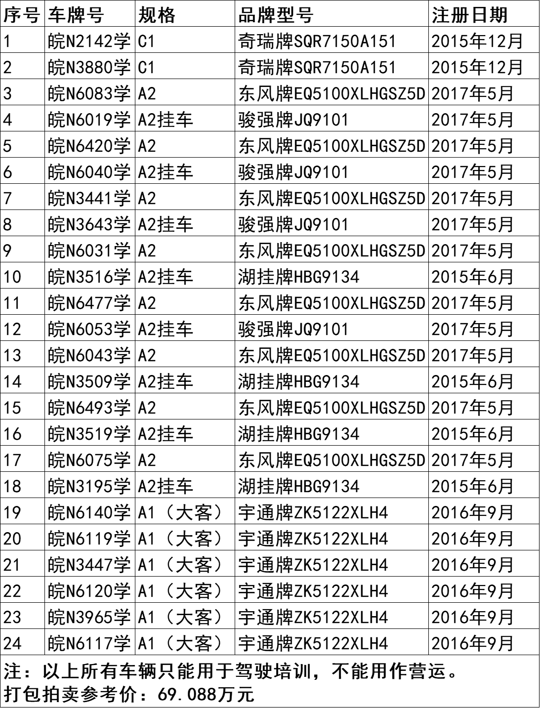 3、皖N2142學(xué)、皖N3880學(xué)奇瑞牌小轎車、皖N6140學(xué)宇通牌大客等24臺二手車,打包拍賣。參考價:69.088萬元,競買保證金:8萬元。標的詳情見下方表格: