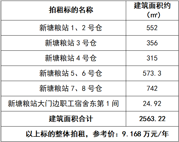 一、拍租標(biāo)的:六安市金安糧食購(gòu)銷有限公司新塘糧站1-8號(hào)倉(cāng)及糧站大門邊職工宿舍東第1間房屋3年期租賃經(jīng)營(yíng)權(quán),整體拍租,建筑面積約:2563.22 ㎡,參考價(jià):9.168萬元/年。標(biāo)的詳情見下表: