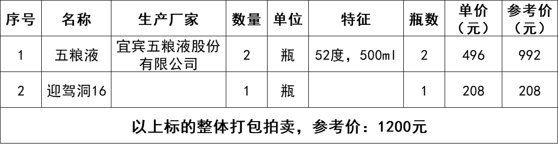 2、五糧液酒2瓶、迎駕洞藏16酒1瓶,整體打包拍賣,參考價:1200元,競買保證金:1000元。標(biāo)的詳情見下方清單: